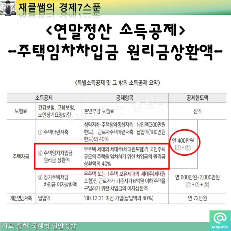 | A | 주택임차자금 차입금 원리금 상환액 | 무주택 세대의 세대주 / 국민주택규모 이하 주택 임차 | 상환액의 40% 공제 (연 300~400만 원 한도) | 소득세법 §52④ |